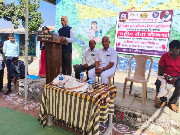 तुळजाभवानी एज्युकेशन सोशल अँड वेल्फर सोसायटी संचलित श्री सप्तशृंगी कला, वाणिज्य व विज्ञान महाविद्यालय डांगसौंदाणे ता. बागलाण जिल्हा नाशिक येथील राष्ट्रीय सेवा योजना (एन.एस.एस) विभागाच्या वतीने आयोजित सात दिवसाचा विशेष हिवाळी श्रम संस्कार शिबिराचा उद्घाटनाचा कार्यक्रम उत्साहात पार पडला 'शाश्वत विकासासाठी युवक पाणलोट आणि पडीक जमीन व्यवस्थापन' या स्कीमच्या आधारे तसेच समाजसेवा, श्रम प्रतिष्ठा आणि ग्रामीण विकास या त्रिसूत्रीवर आधारित कार्यक्रम पार पडला कार्यक्रमाचे अध्यक्ष डॉ. मुरलीधर विठ्ठल हिरे प्राचार्य श्री सप्तशृंगी महाविद्यालय तर माननीय डॉ. डी. के आहेर (राष्ट्रीय सेवा योजना) जिल्हा समन्वयक व प्रमुख अतिथी संस्थेचे संस्थापक अध्यक्ष मा. श्री संजय पंडितराव सोनवणे ग्रामसेवक आर. जी गायकवाड व दहिंदुले गावचे ग्रामस्थ हजर होते कार्यक्रम प्रसंगी उद्घाटक डॉ. आहेर यांनी राष्ट्रीय सेवा योजनेची माहिती दिली, तसेच विद्यार्थ्यांमध्ये सेवाभावी वृत्ती, नेतृत्वगुण, राष्ट्रप्रेम, भावना निर्माण करण्याचे कार्य राष्ट्रीय सेवा योजना सातत्याने करीत आहे असे प्रतिपादन केले. तसेच मा. संस्थेचे अध्यक्ष श्री संजय पंडितराव सोनवणे यांनी विद्यार्थी हा समाजाचा दीर्घकालीन सकारात्मक बदल घडू शकतो व अनुभवातून शिकण्याची संधी देते असे त्यांनी सांगितले, तसेच कार्यक्रमाचे प्रास्ताविकाने विद्यार्थ्यांना समाजाशी जोडण्याचे महत्व पटवून दिले तसेच अध्यक्ष भाषणात प्राचार्य हिरे यांनी गावाच्या विकासासाठी स्थानिक युवकांनी संघटितपणे काम करणे आवश्यक आहे असे प्रतिपादन केले. कार्यक्रमाचे उत्कृष्ट सूत्रसंचालन राष्ट्रीय सेवा योजना महिला अधिकारी प्राध्यापिका रेना बाविस्कर यांनी केले तर कार्यक्रमाचे आभार राष्ट्रीय सेवा योजना चे अधिकारी नाडेकर आर.डी यांनी केले कार्यक्रमासाठी दहींदुले ग्रामस्थ, संस्थेचे प्रशासकीय अधिकारी श्री बंटी हिरे व राष्ट्रीय सेवा योजना स्वयंसेवक प्राध्यापक, प्रशासकीय कर्मचारी हजर होते.