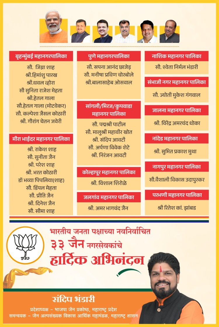 मुंबई : प. पू. आचार्य श्री नयपद्मसागर महाराज जी तसेच साध्वी श्री मयनाश्री जी यांच्या पावन सानिध्यात जैन इंटरनॅशनल ऑर्गनायझेशन, अखिल भारतीय जैन अल्पसंख्यक महासंघ आणि भाजपा जैन प्रकोष्ठ, महाराष्ट्र प्रदेश यांच्या संयुक्त विद्यमाने भारतीय जनता पक्षातून नवनिर्वाचित ३३ जैन नगरसेवकांचा भव्य सत्कार समारंभ मुंबई येथे अत्यंत उत्साहपूर्ण व सन्माननीय वातावरणात संपन्न झाला.